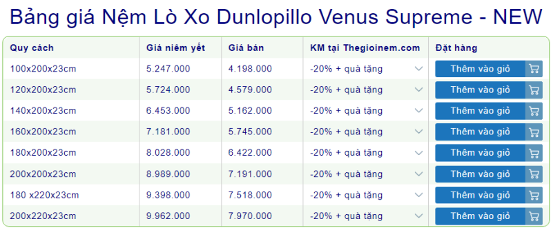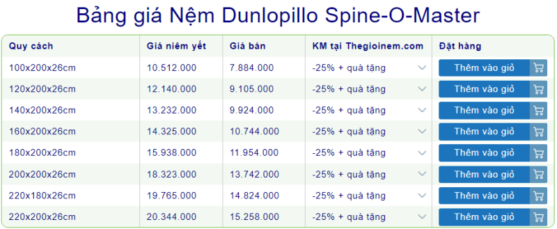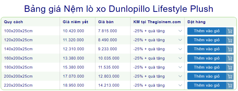 1. Bảng giá nệm lò xo liên kết Dunlopillo