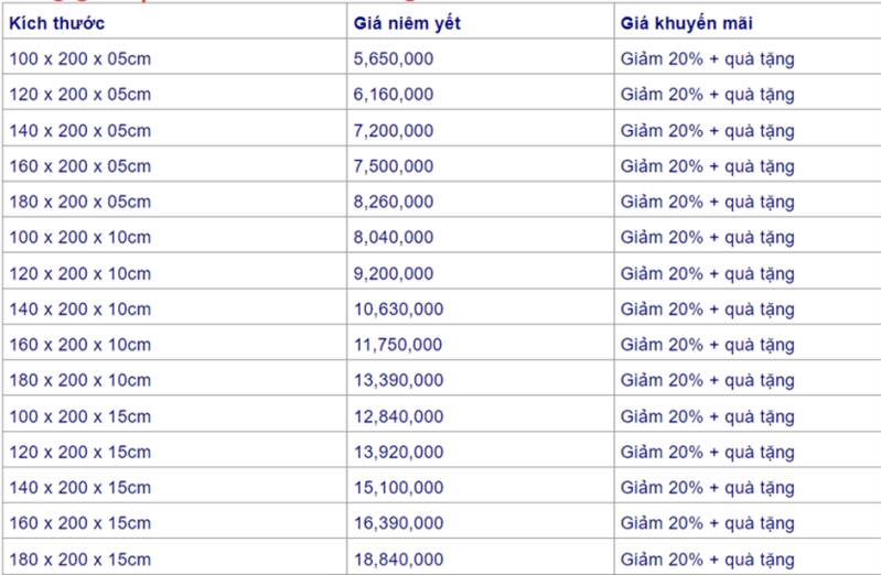 Bảng giá nệm cao su Liên Á